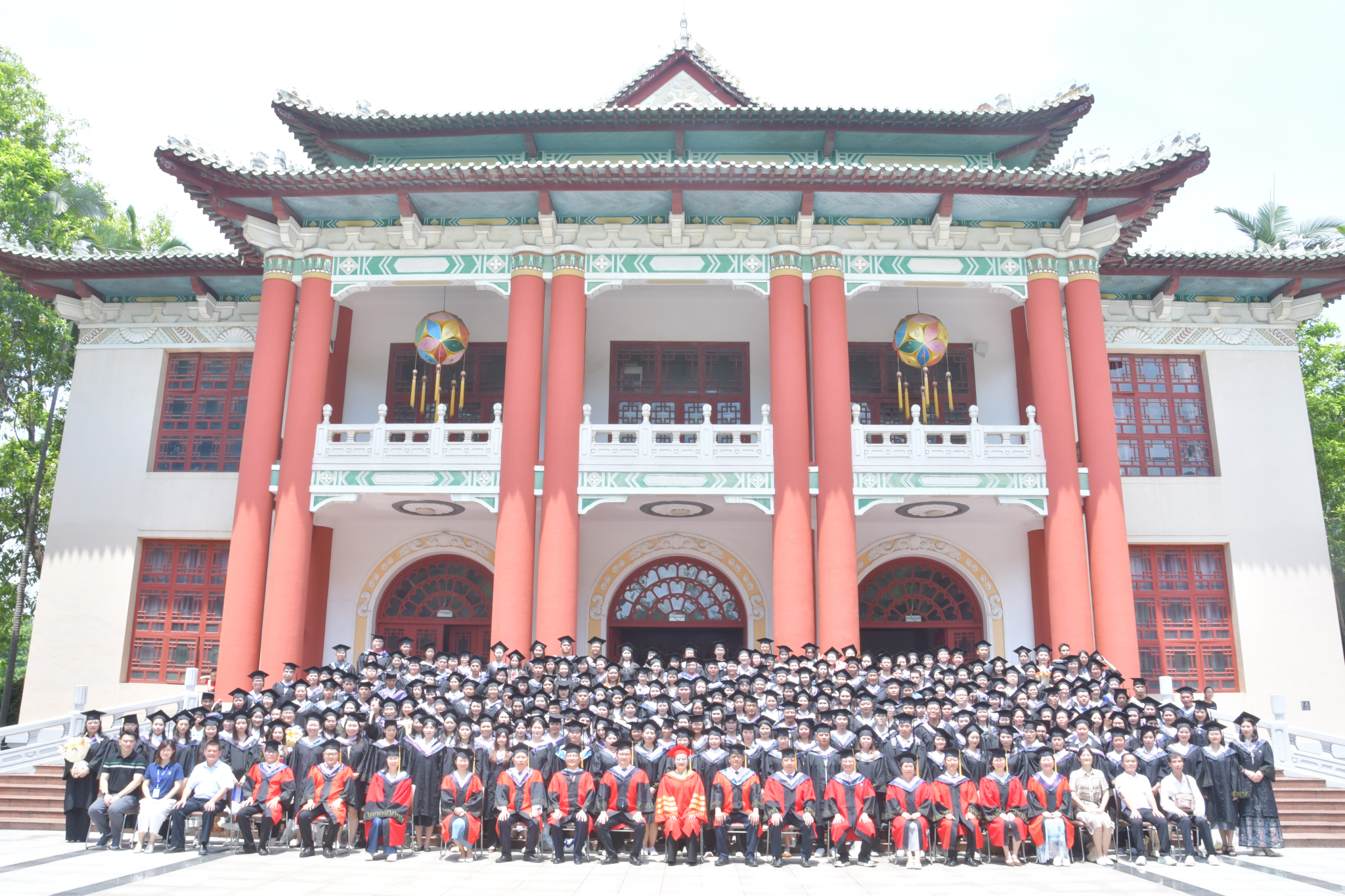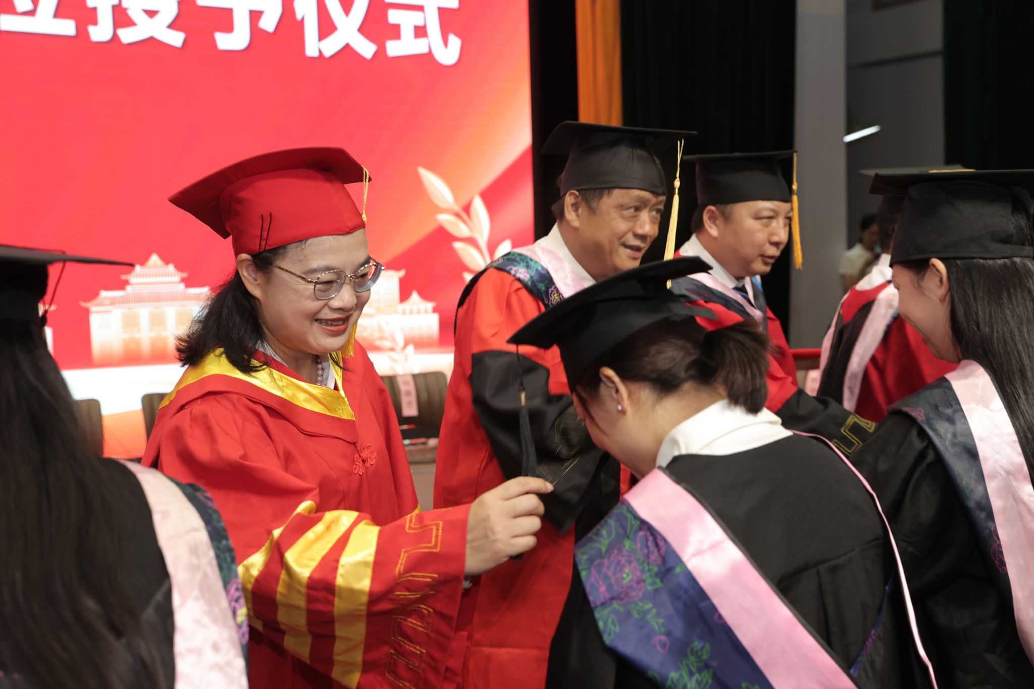 在毕业典礼暨学位授予仪式上,韦仕珍校长为毕业生颁发毕业证书,学校及学院学位评定委员会组成的导师团为毕业生代表依次拨穗正冠。