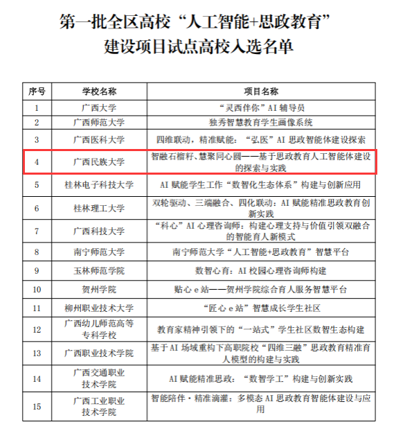 近日,广西壮族自治区教育厅公布第一批全区高校“人工智能+思政教育”建设项目试点高校名单,澳门网投官方网站成功入选,成为首批15所试点高校之一。