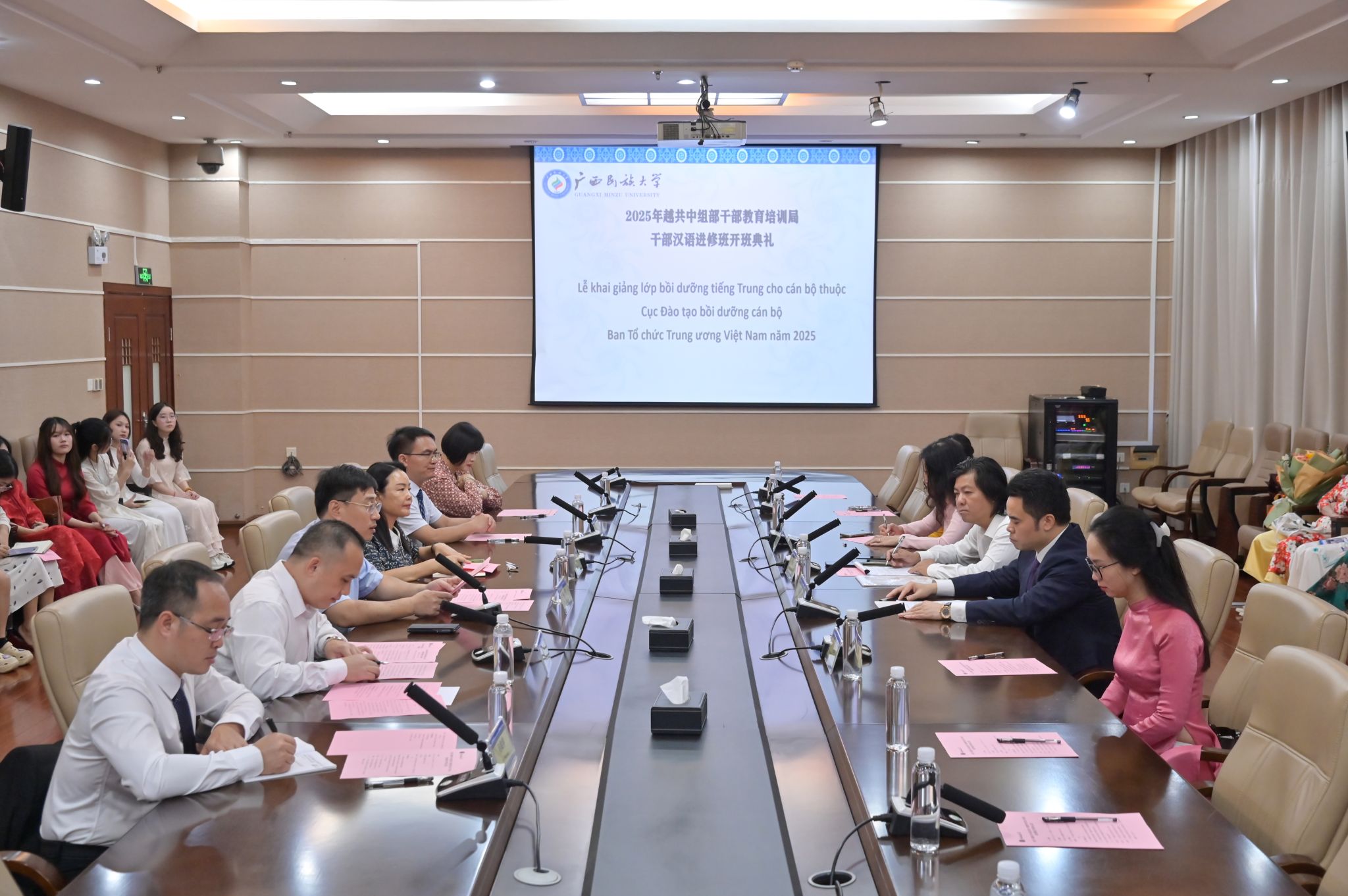 9月12日,高兴宇在2025年越共中央组织部干部教育培训局干部汉语进修班开班典礼上表示,学校高度重视中越教育合作发展,成立工作专班,配备优质师资,精心设计课程,力争高质量完成培训任务,希望学员将所学成果转化为推动中越合作发展的实际行动,为促进中越人文交流与教育合作贡献力量。(初审/石岳 图文/吴浩 编/黎倩雅 复审/李建瑾 终审/孙寿媚)
