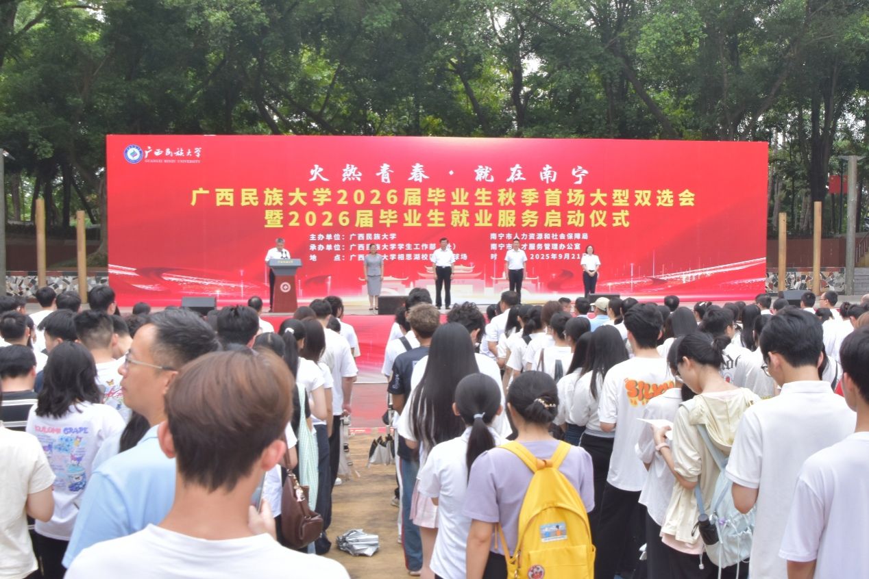 【大学生通讯社报道】9月21日上午,澳门网投官方网站举行2026届毕业生秋季首场大型双选会暨2026届毕业生就业服务启动仪式。校党委书记唐平秋出席仪式并讲话,校长韦仕珍出席活动,校党委副书记陈铭彬主持仪式。南宁市人力资源和社会保障局副局长陆多迎、各学院负责同志、教师及学生代表参加。