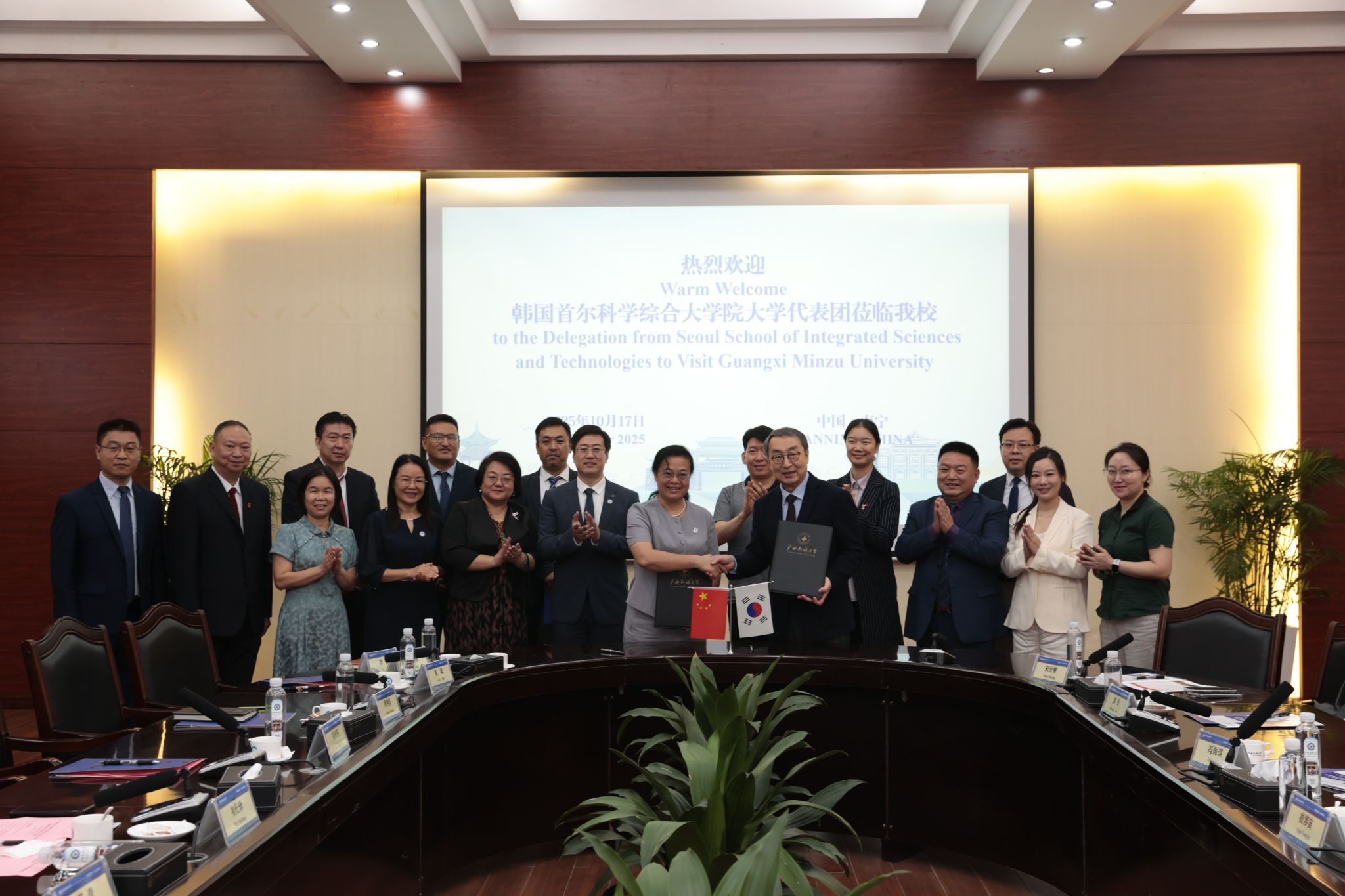 会后,韦仕珍、崔溶宙签署两校合作协议,代表双方互赠纪念品并合影留念。(初审:罗明 复审:潘之铭 韦利坤 终审:孙寿媚)