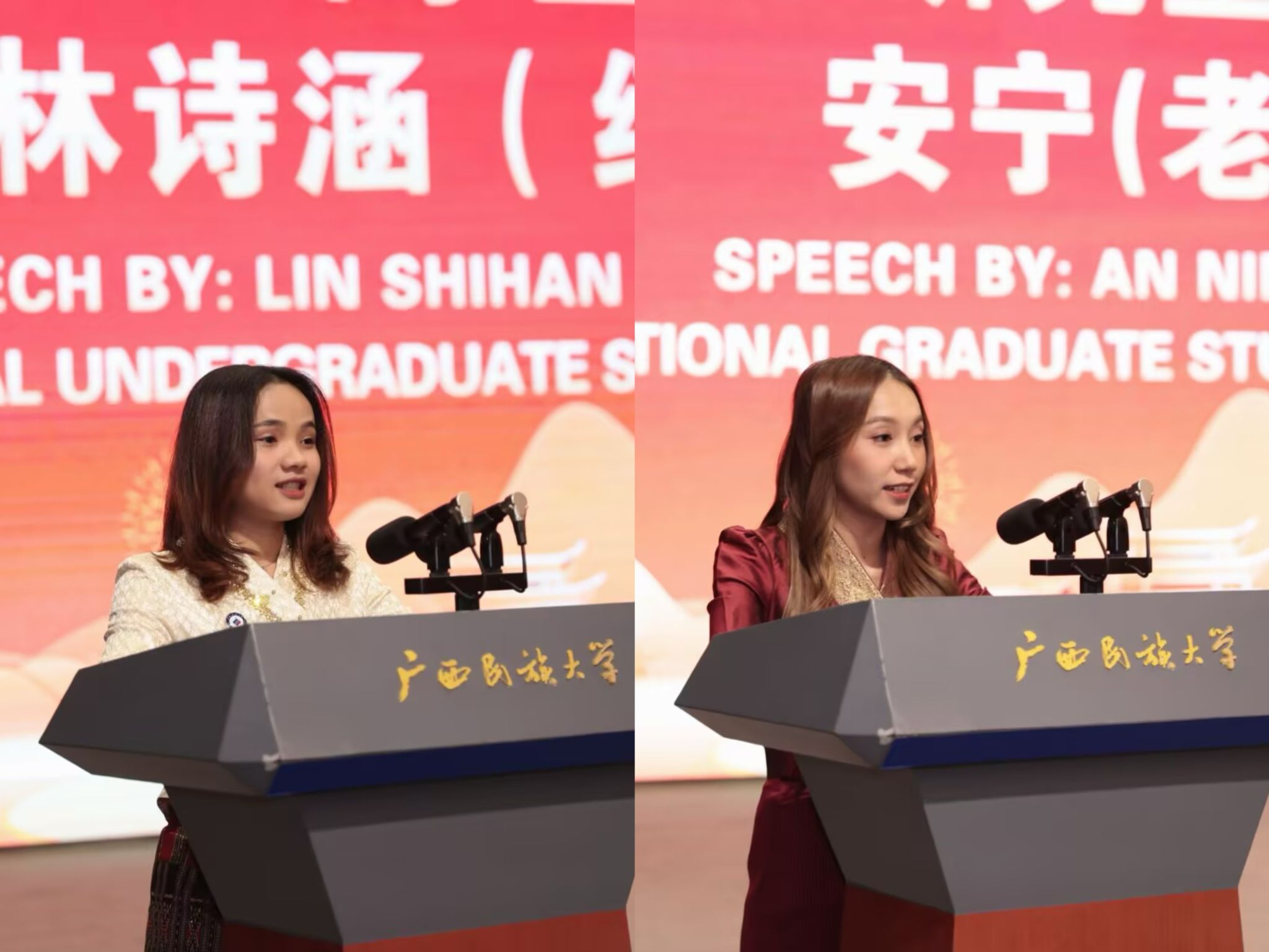 国际教育学院2023级汉语国际专业缅甸籍本科生林诗涵、文学院2023级国际中文教育专业老挝籍硕士研究生安宁发言