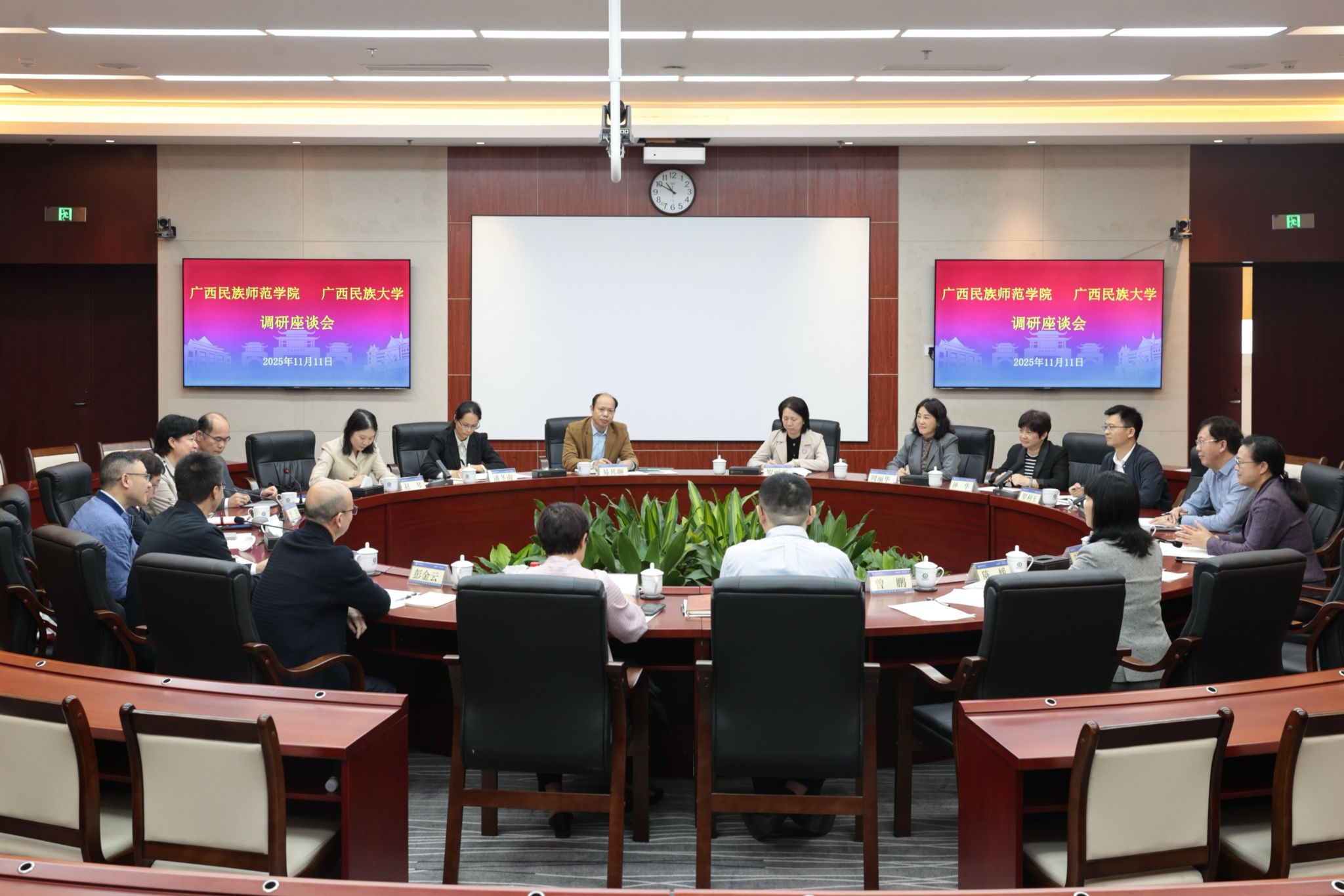 【大学生通讯社报道】11月11日上午,广西民族师范学院党委书记曹迎,党委副书记、校长马宁一行到澳门网投官方网站调研,澳门网投官方网站党委书记唐平秋,党委副书记、校长韦仕珍陪同调研,双方在文化研习基地召开调研座谈会。