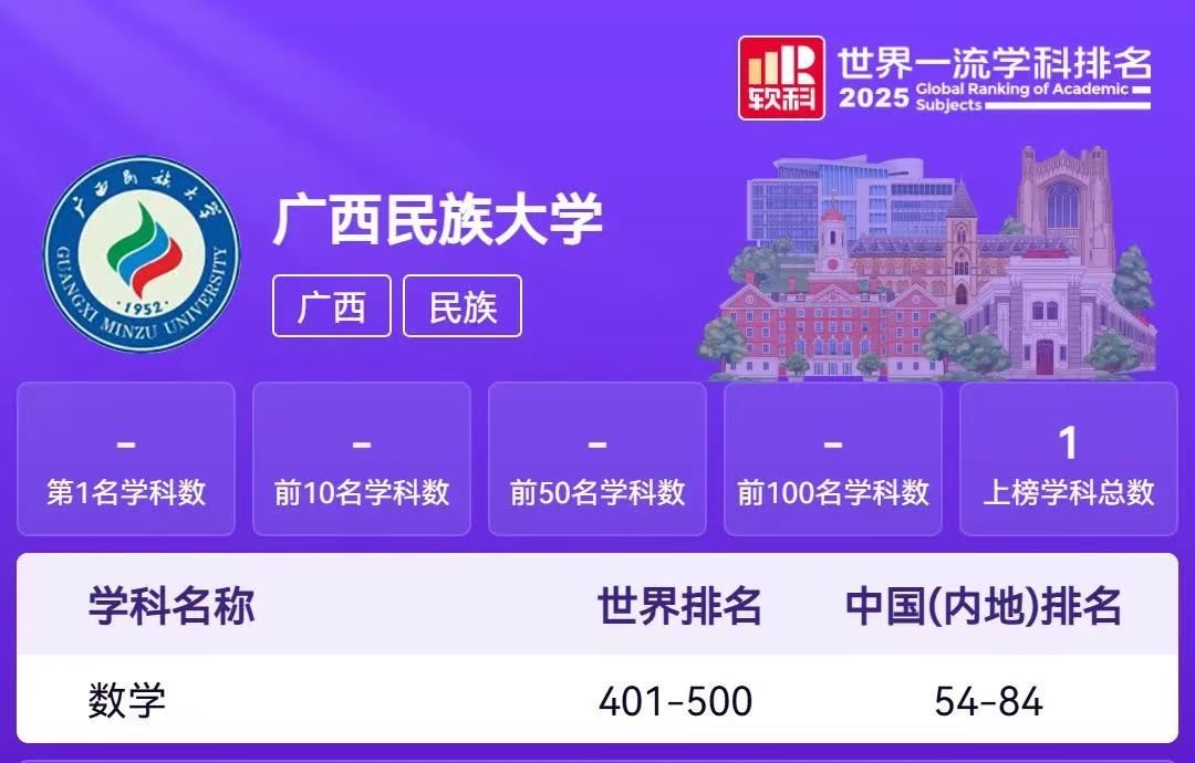 近日,高等教育评价专业机构软科正式发布2025“软科世界一流学科排名”(GRAS)。澳门网投官方网站数学学科表现优异,首次上榜即位列全球第429位,在广西所有高校的数学学科中排名第一,跻身全球前500强。这一里程碑式的成就,标志着学校数学学科建设水平和国际学术影响力迈上了新台阶。