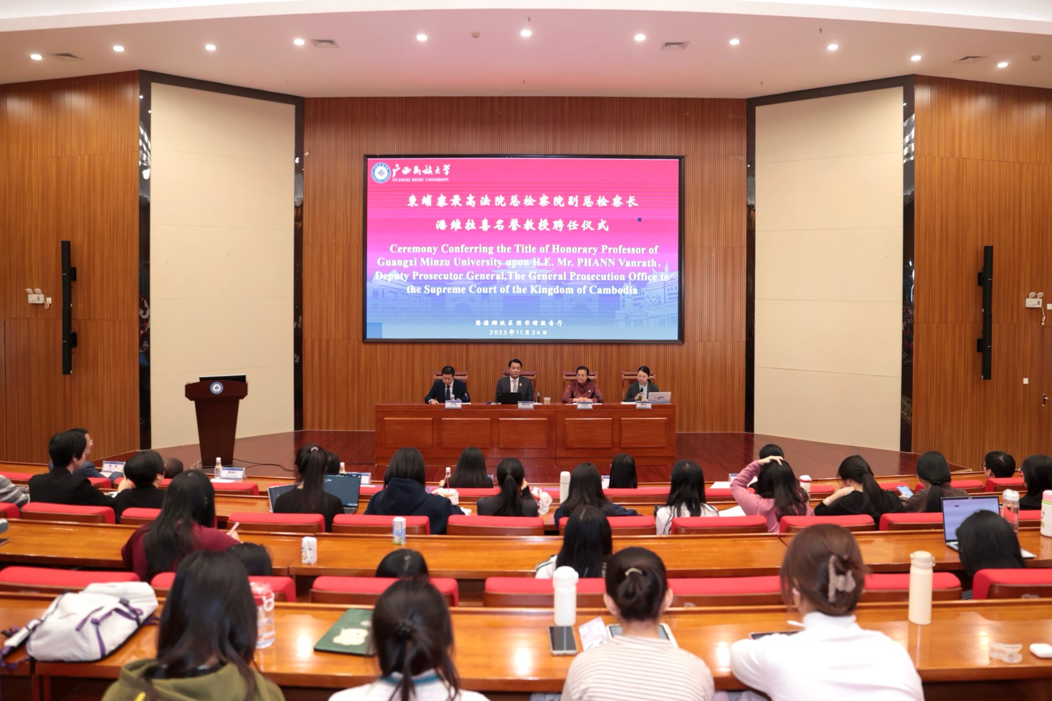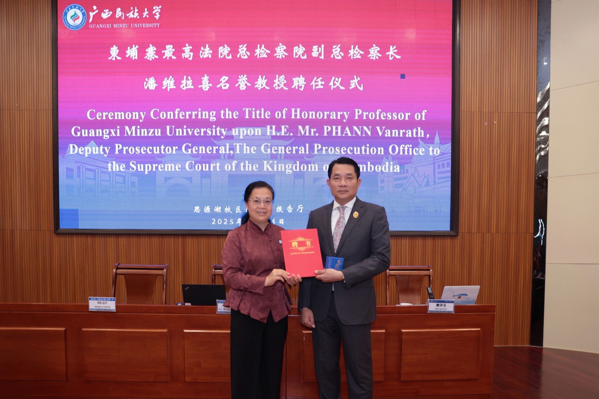 【大学生通讯社报道】11月24日下午,澳门网投官方网站在思源湖校区图书馆二楼报告厅举行名誉教授聘任仪式,聘任柬埔寨最高法院总检察院副总检察长潘维拉喜(H. E. PHANN VANRATH)为名誉教授,校长韦仕珍出席仪式并为潘维拉喜颁发聘书。校党委副书记、中国-东盟法学院院长邓国彬出席并主持仪式。