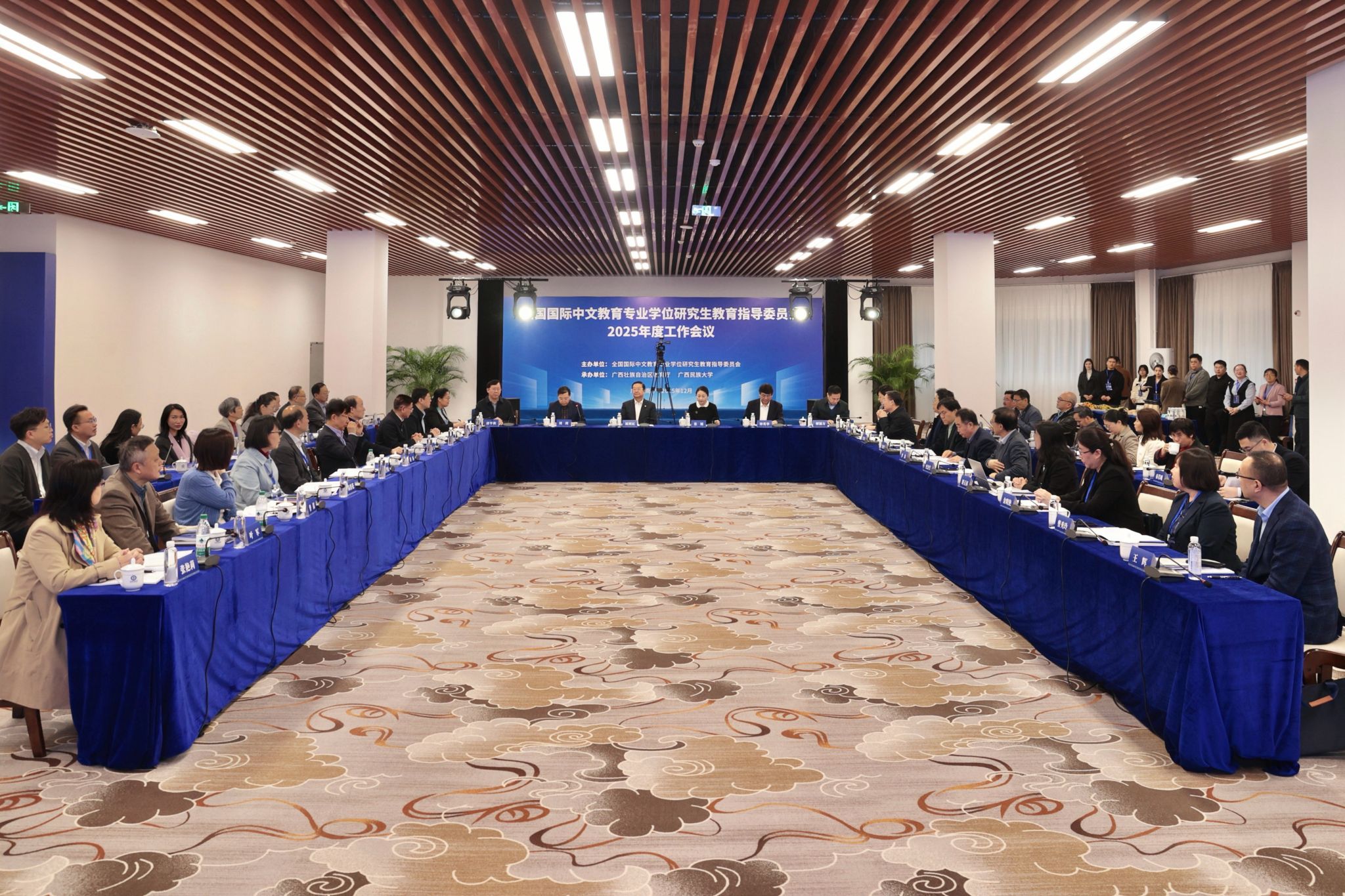 【大学生通讯社报道】12月16日,全国国际中文教育专业学位研究生教育指导委员会(教指委)2025年度工作会议在澳门网投官方网站召开。教指委主任委员、中国教育国际交流协会会长刘利民,教育部中外语言交流合作中心党委副书记张旭,澳门网投官方网站党委书记唐平秋、校长韦仕珍,广西壮族自治区教育厅副厅长傅源方,教指委副主任委员刘利以及29位教指委委员出席会议。教指委副主任委员、中国国际中文教育基金会副理事长刘利和教指委副主任委员、世界汉语教学学会会长钟英华分别主持上下半场会议,教指委秘书长任世芳作教指委年度工作和未来重点工作计划汇报。