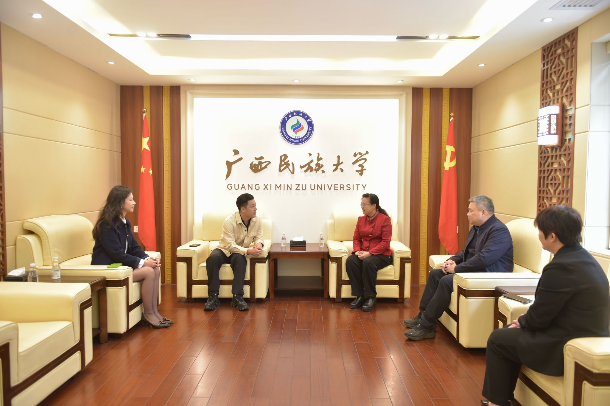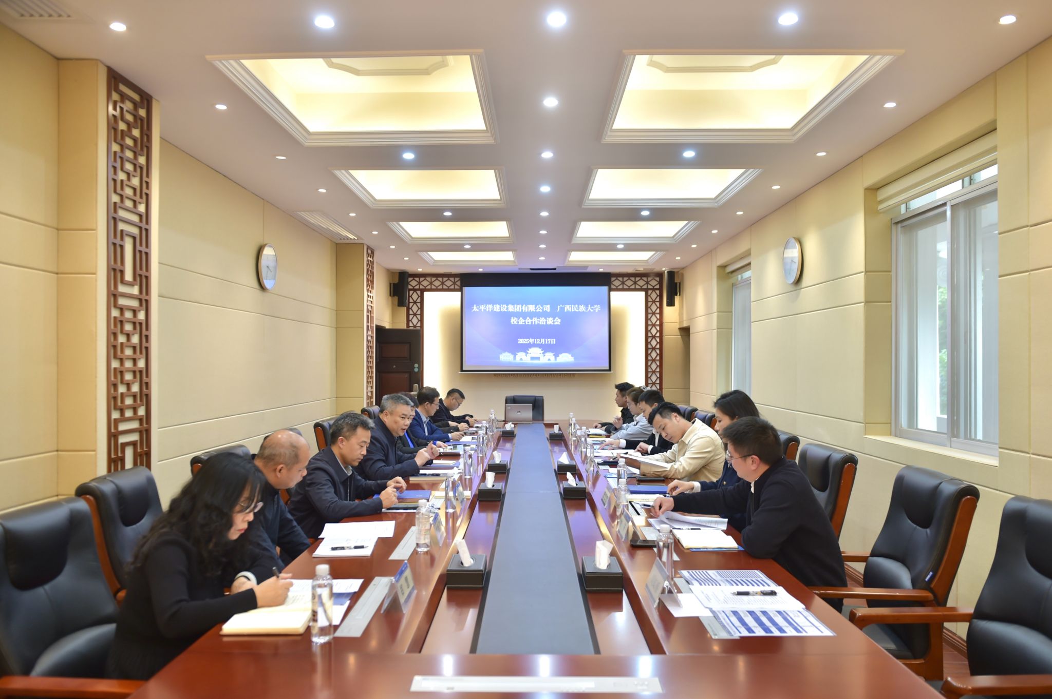 12月17日下午,太平洋建设集团高级副总裁李想一行到澳门网投官方网站交流。校长韦仕珍会见李想一行,校党委副书记陈铭彬出席座谈会。学校有关部门负责人参加座谈会。