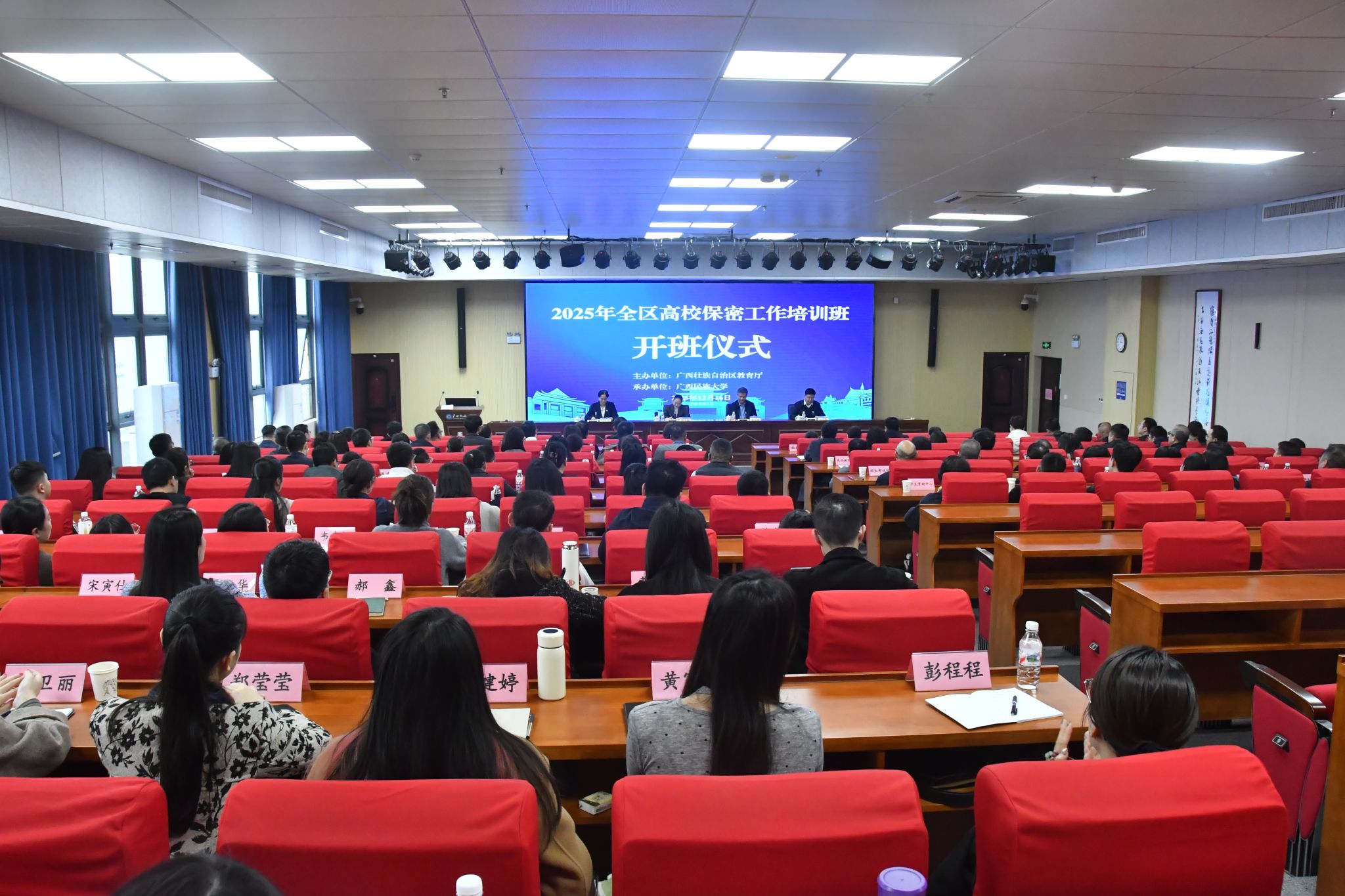 12月16日,校党委副书记、纪委书记韦雪芳出席2025年全区高校保密工作培训班开班仪式并致辞。自治区党委保密办、自治区国家保密局领导作专题报告,自治区教育厅二级巡视员农汉康出席并讲话。自治区党委教育工委、自治区教育厅机关各部处室、直属事业单位及全区各高校保密工作有关负责人参加培训。本次培训自12月16日至18日,为期三天。(初审/刘银妹 图文/卢思然 编/黎倩雅 实习编辑:苗予嘉 复审/韦利坤 终审/孙寿媚)