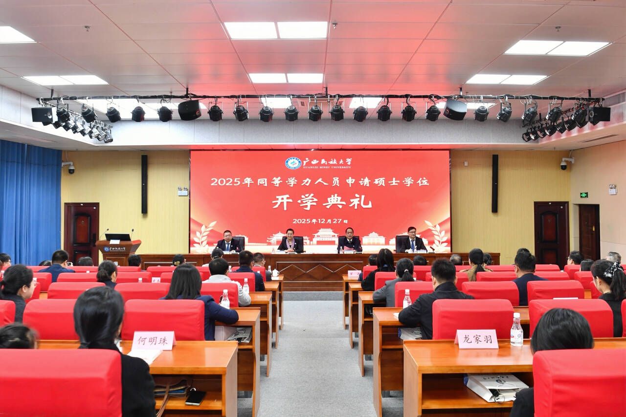 【大学生通讯社报道】12月27日上午,澳门网投官方网站在相思湖校区图书馆13楼报告厅学术交流厅召开2025年同等学力人员申请硕士学位开学典礼。校长韦仕珍出席典礼并致辞,各有关学院负责人,70名2025年同等学力人员申请硕士学位学员参与典礼。学校党委常委、副校长蔡高根主持典礼。