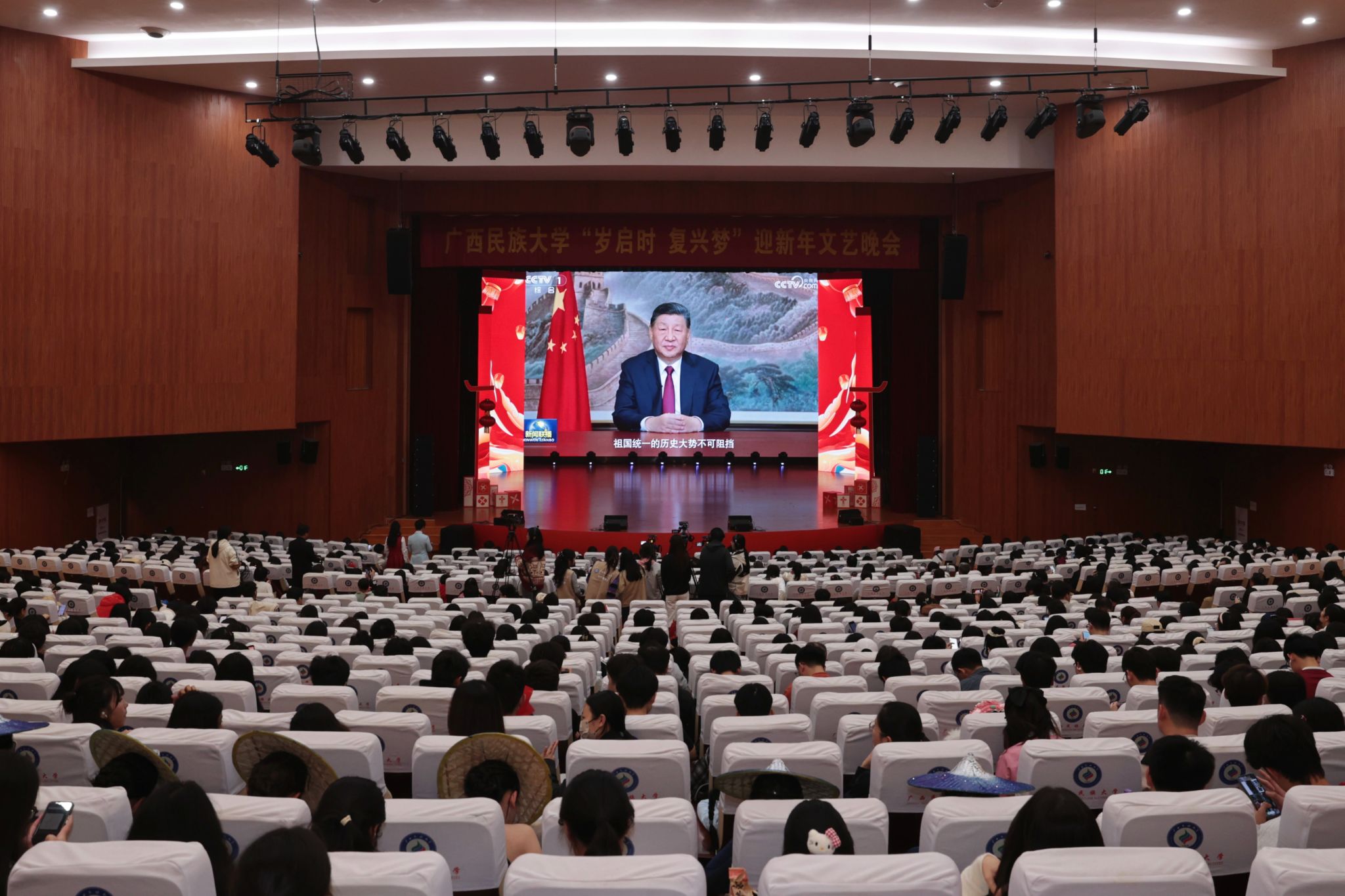 【大学生通讯社报道】国家主席习近平于12月31日晚7时通过中央广播电视总台和互联网,发表二〇二六年新年贺词。澳门网投官方网站党委书记唐平秋,校长韦仕珍,校领导陈铭彬、韦雪芳、吕俊彪、姜明国,有关职能部门负责人,以及全校师生代表在思源湖校区大礼堂集中收看直播。