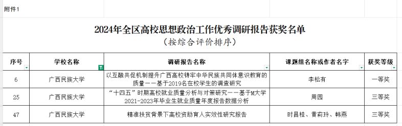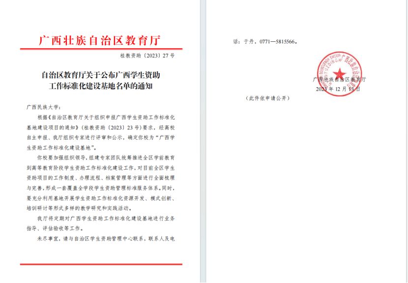 精准帮扶传递人文关怀。学校持续完善“奖、助、贷、勤、补、免”多位一体资助体系,坚决做到“不让一个学生因家庭经济困难而失学”。获批广西学生资助工作标准化建设基地,《石榴花开》获资助育人实践基地培育项目,承担自治区学生资助专项重点课题2项。“新疆籍学生助飞计划”获得自治区好评。