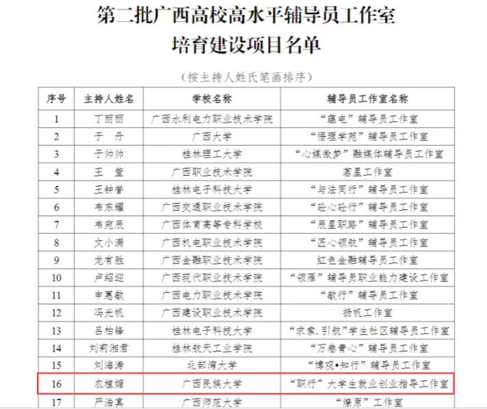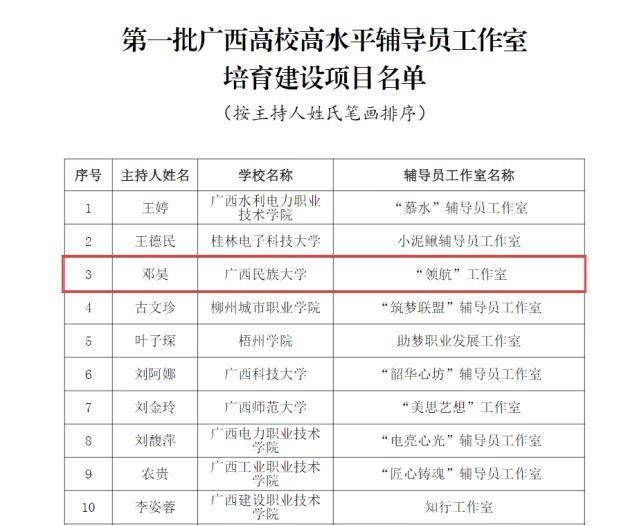 搭建平台,促进辅导员交流协同。与广西大学、广西建设职业技术学院等高校共同发起“新时代·新学工”三方论坛,聚焦前沿议题开展深度研讨。培育13个辅导员工作团队、6个赋能工作室,其中4个工作室获广西高水平辅导员工作室立项,队伍的专业化水平和育人合力显著增强。