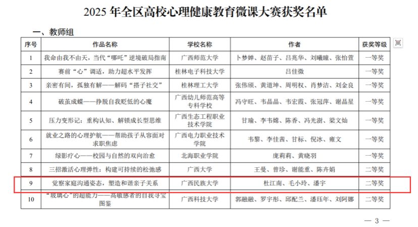 学校《察觉家庭沟通姿态,塑造和谐亲子关系》作品获2025年全区高校心理健康教育微课大赛(教师组)二等奖