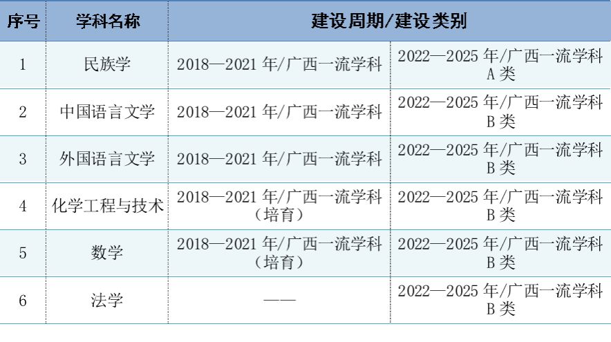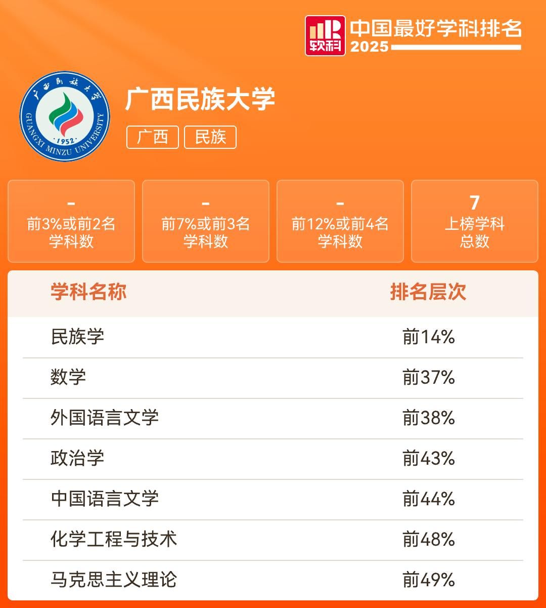 2025年11月,学校首次进入QS亚洲大学排名,位列广西第二;在2025软科民族类大学排名中位列第4。第五轮全国学科评估、全国专业学位水平评估中取得新突破,6个学科分别进入前70%及以上,其中3个学科实现历史性突破,尤其是民族学在第四轮全国学科水平评估结果B的基础上实现重大突破。学科国际影响力进一步提升,2023年7月工程学进入ESI全球前1%,实现零的突破;2024年5月化学相继进入ESI全球前1%。3个学科入选2025-2026年度U.S.News世界大学学科排名。2025年1个学科(数学)首次跻身软科世界一流学科排名,7个学科上榜软科2025“中国最好学科”,其中民族学位列全国第5。