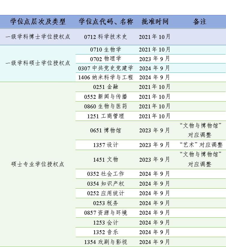 “十四五”以来,学校以新增博士点培育建设为抓手,顶层设计立项培育建设博士学位授权点、成立校领导为组长的博士点工作专班,多措并举推进学位点建设提质扩容。新增科学技术史博士学位授权点,实现理科博士点“零的突破”;新增硕士学位点17个,其中一级学科硕士点4个、专业学位类别硕士点13个。在积极拓展增量的同时,学校稳步推进学科专业动态调整。2023年,自主撤销2个二级学科硕士点,增列1个一级学科硕士点,对应调整优化3个专业学位类别硕士点。2024年,完成民族学二级学科体系优化。2025年,学校获批纳入首批“中华民族共同体学交叉学科建设试点单位”,完成该交叉学科的论证与备案;自主设置并备案“国别和区域研究”“国家安全治理”两个目录外二级学科。