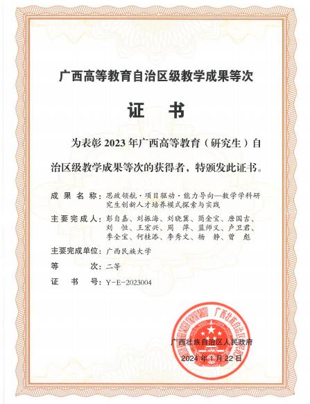 《思政领航·项目驱动·能力导向——数学学科研究生创新人才培养模式探索与实践》获2023年广西高等教育(研究生)自治区级教学成果奖二等奖。
