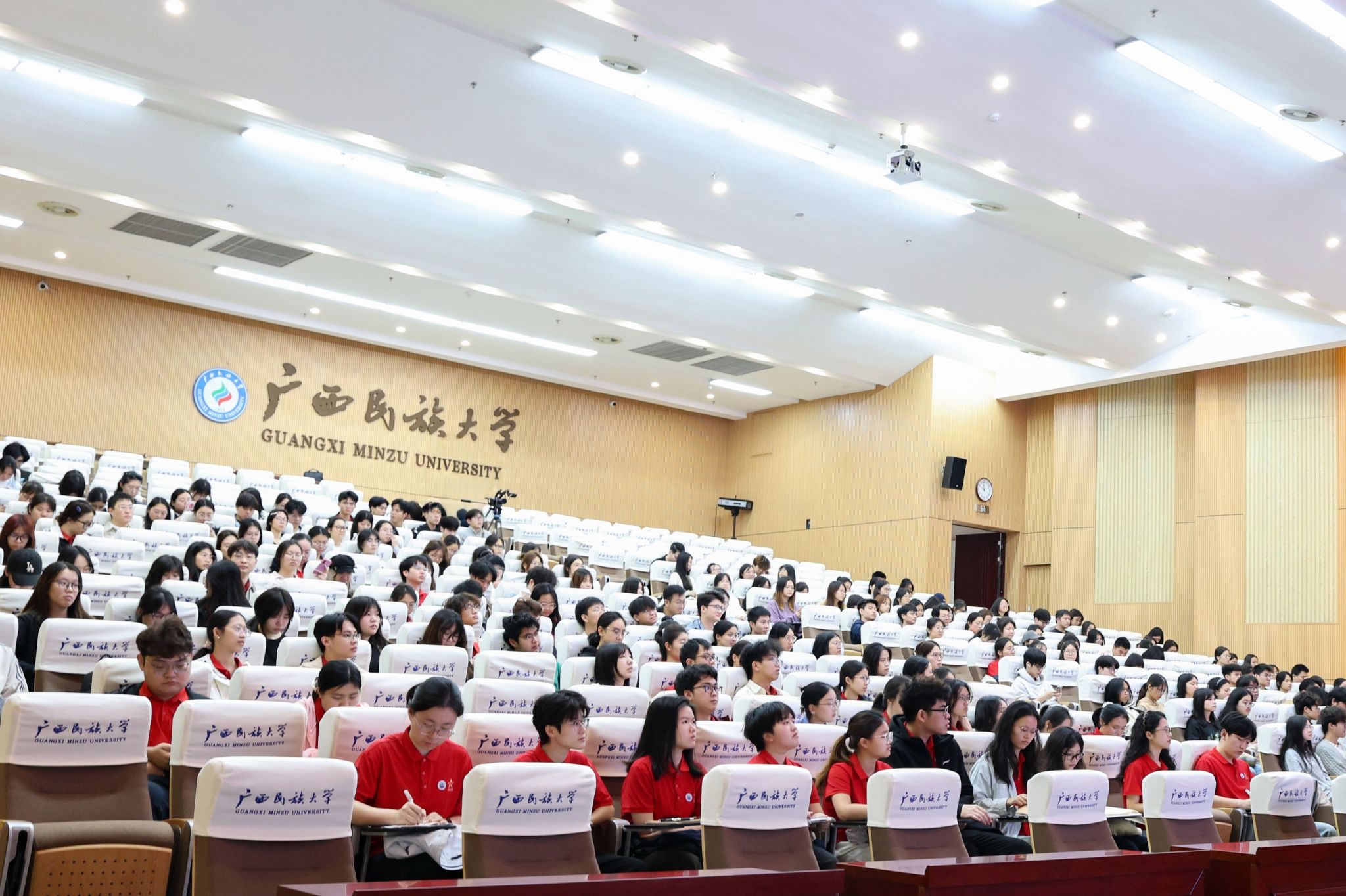 课上,唐平秋深入解读了全国两会精神和国家“十五五”规划纲要,强调2026年是“十五五”开局起步的关键一年,深入学习贯彻全国两会精神是当前和今后一个时期的重要政治任务。课堂还重点分析了“十五五”时期广西发展机遇以及学校实现高质量发展的战略优势,并介绍十四届全国人大四次会议审议通过的《中华人民共和国民族团结进步促进法》将于今年7月1日起正式施行。唐平秋指出,未来五年,学校将紧扣国家重大战略部署,紧密对接广西重点产业需求,以铸牢中华民族共同体意识为主线,依托现有办学特色和学科优势,在服务民族地区现代化建设、中华民族共同体建设和中国-东盟命运共同体建设中贡献民大力量。