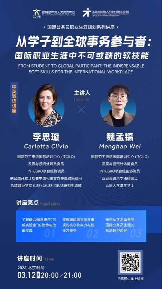 在全球化深度发展与国际格局深刻演变的背景下,参与全球治理、投身国际事务已成为新时代青年呼应国家战略、实现职业价值的重要选择。为响应这一号召,破解大学生群体投身国际事务的信息壁垒,解答其路径困惑,自2020年起,“国际公务员职业生涯规划系列讲座”始终紧扣国家人才培养导向,以公益之心搭建青年链接国际组织的桥梁,助力青年打破职业信息壁垒,深化对国际组织运作模式与职业发展的认知理解。