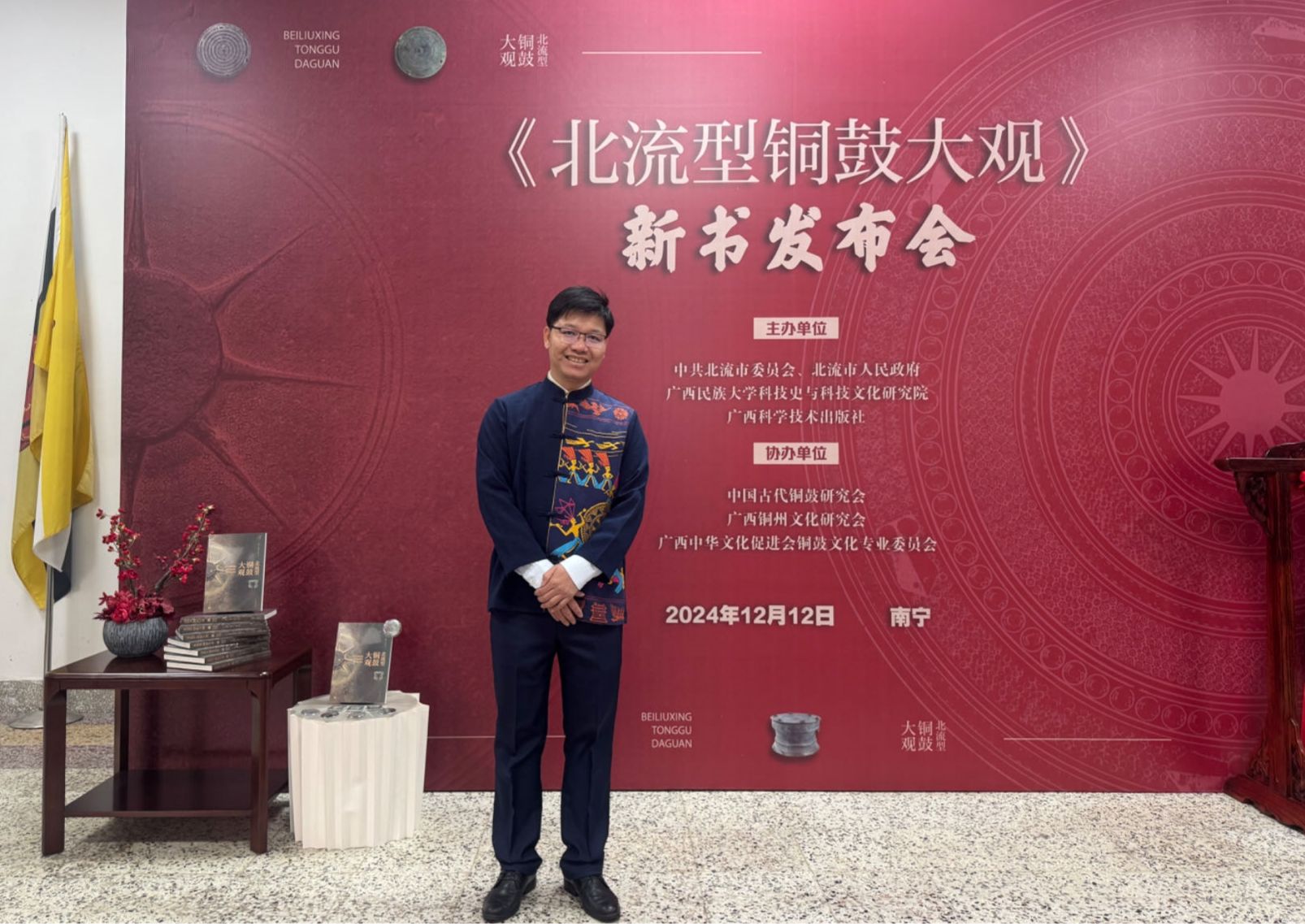 受北流市委宣传部的委托,作为主编之一的他精心编撰《北流型铜鼓大观》一书,该书已于2024年7月出版。在编写过程中,他系统地整理和研究北流型铜鼓,深入挖掘其背后的历史文化内涵和艺术价值,为地方文化遗产的保护和研究提供了重要的文献资料和理论支撑。同时,他深入开展“古代含砷麻江型铜鼓”有关课题研究,从科技考古的角度出发,探讨铜鼓工艺与文化意涵,努力推动传统文化在现代社会的创造性转化和创新性表达,让古老的铜鼓文化在新时代焕发出新的生机与活力。