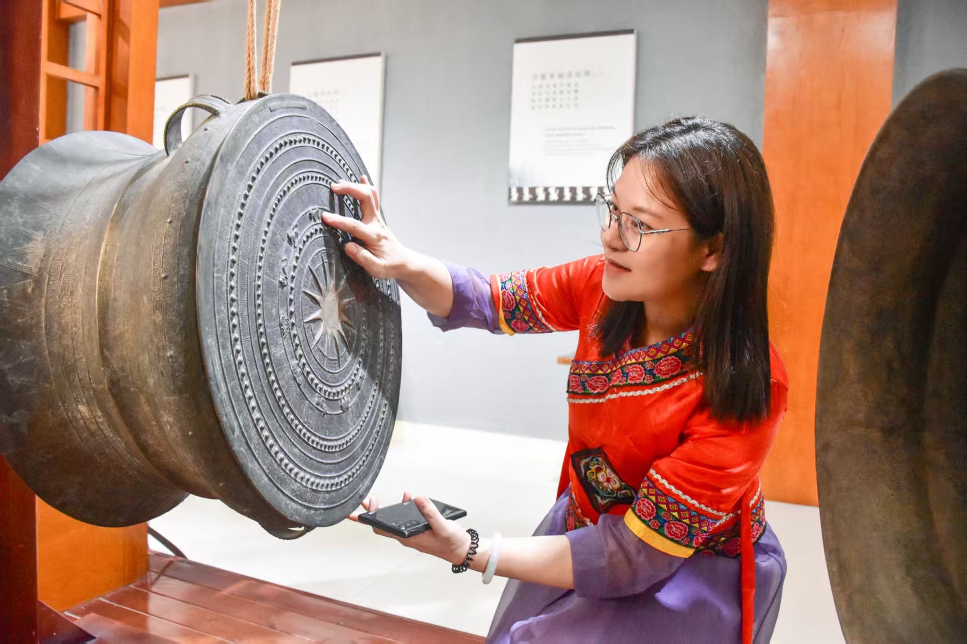 2022年,黄玲在东兰调查铜鼓