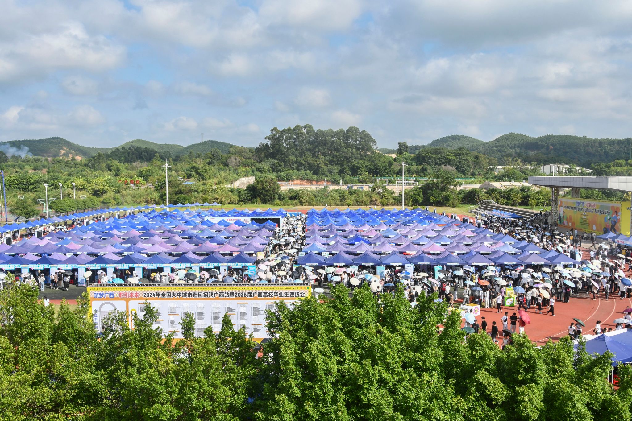 【大学生通讯社报道】10月19日,2024年全国大中城市巡回招聘广西站暨2025届广西高校毕业生双选会在澳门网投官方网站思源湖校区举行。自治区人力资源和社会保障厅二级巡视员侯龙生,澳门网投官方网站党委常委、副校长姜明国到场调研。