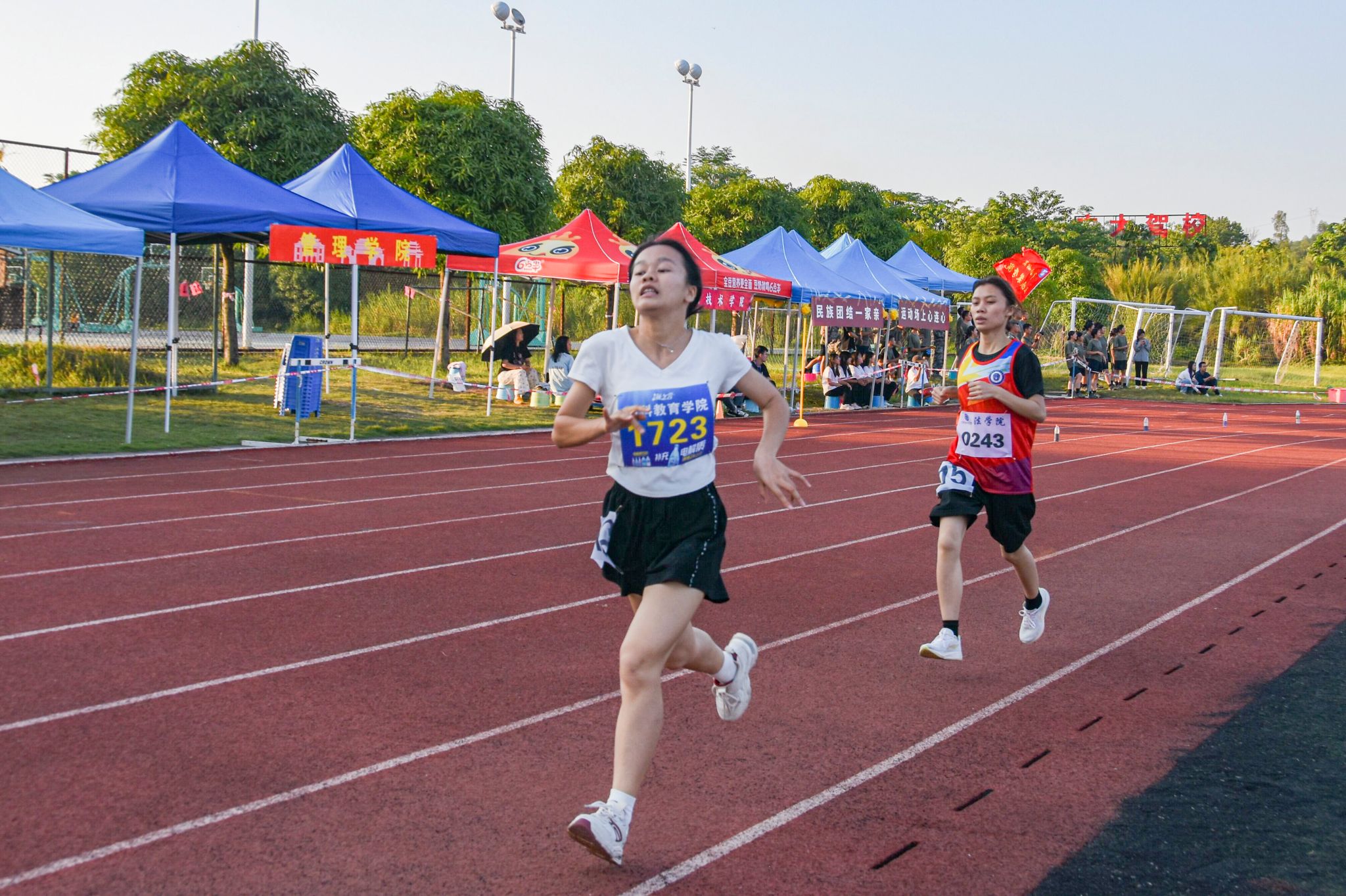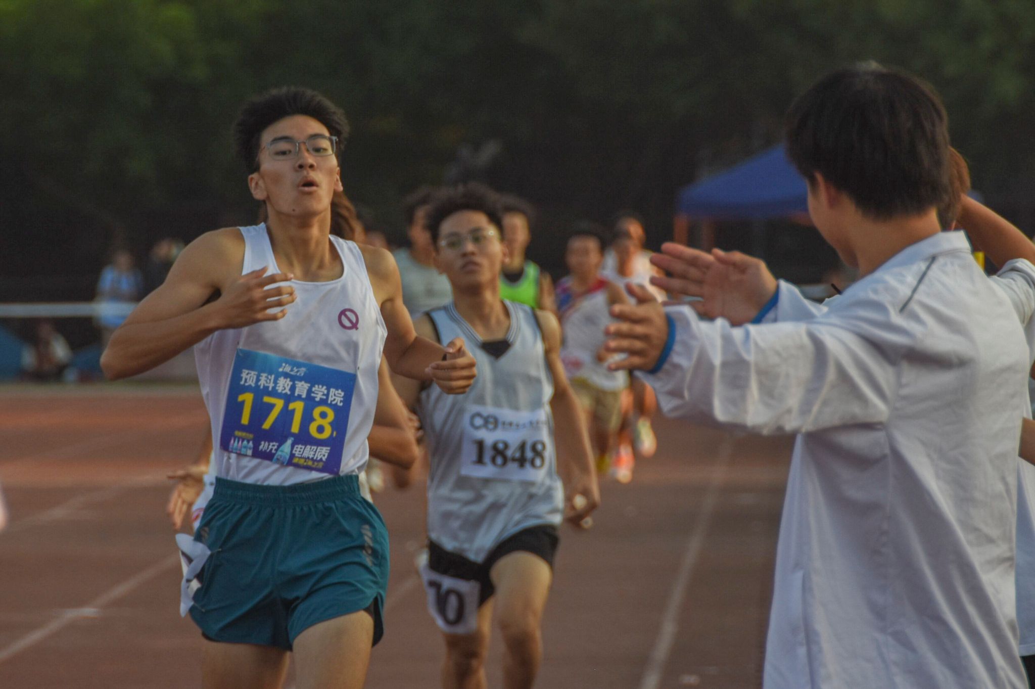 1日下午4时,在男、女子甲组1500米决赛中,政治与公共管理学院2022级政治学与行政学专业的廖晴晴、化学化工学院2022级化学(师范类)专业的苏德臻一马当先,全程处于领先位置,以绝对优势率先冲过终点线。最终,廖晴晴以5分53秒96的成绩获得女子组冠军,苏德臻以4分12秒96的成绩获得男子组冠军。