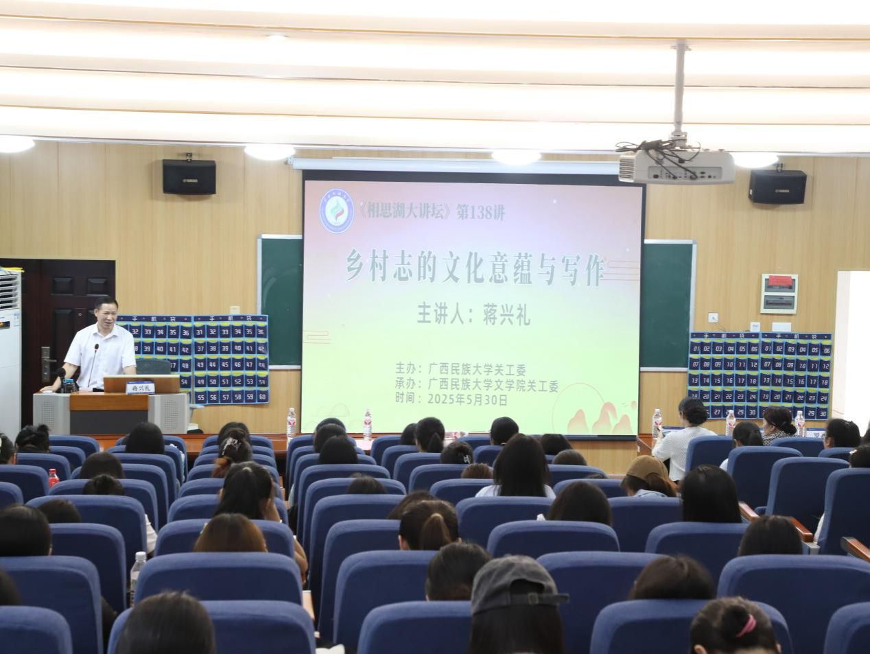 5月30日下午,“相思湖大讲坛”第138讲——“乡村志的文化意蕴与写作”主题讲座在博文楼一教一梯举行。本次讲座由原百色学院党委副书记、纪委书记蒋兴礼研究员主讲,文学院李惠玲教授主持。文学院党委书记陆晓芹教授、学校关工委教师代表、文学院学生代表参加讲座。