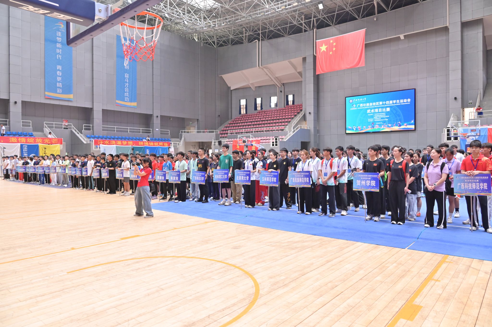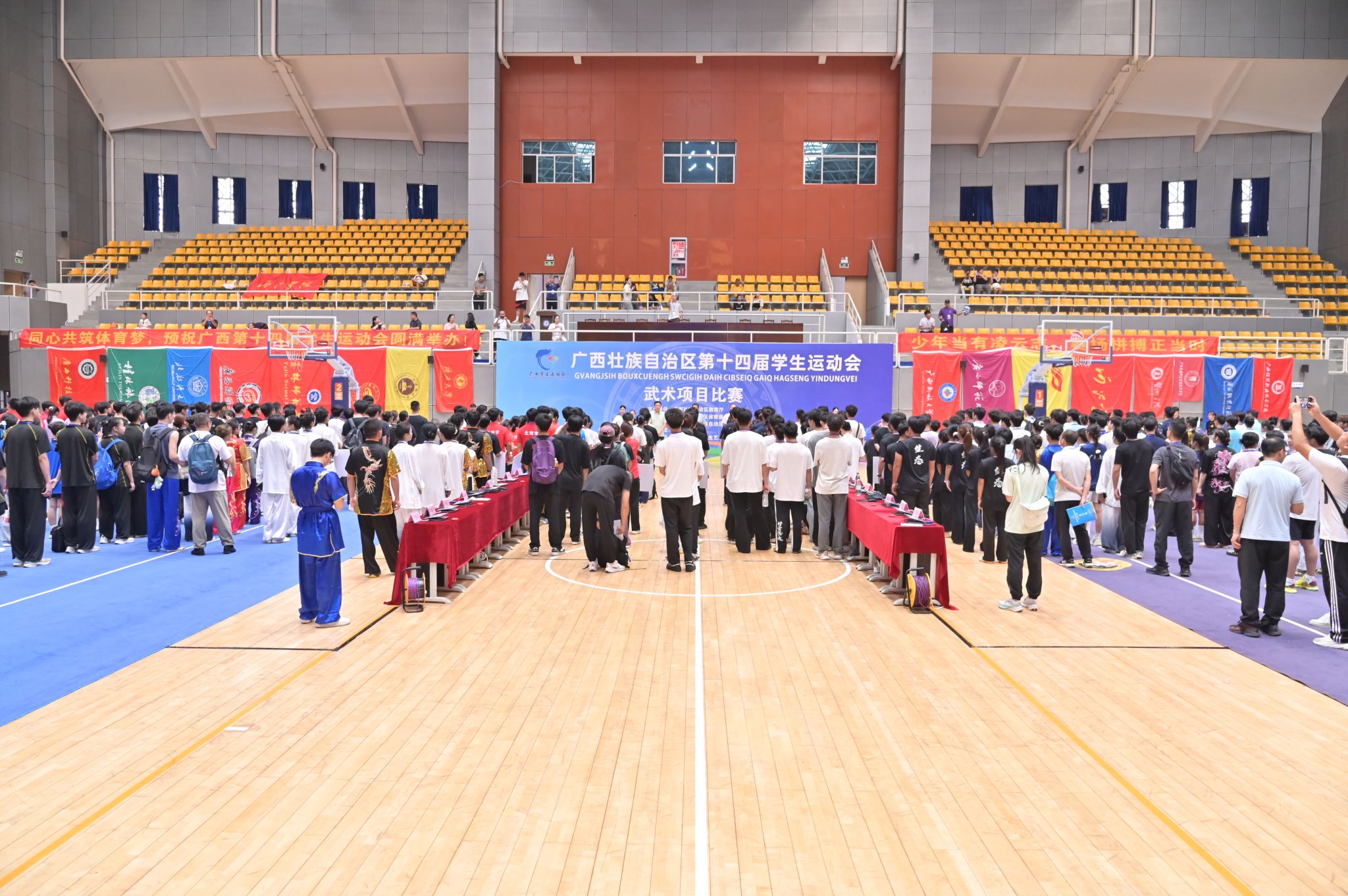 【大学生通讯社报道】7月6日,广西壮族自治区第十四届学生运动会武术项目比赛开幕式在澳门网投官方网站思源湖校区体育馆举行。广西学校体育卫生艺术学会会长、澳门网投官方网站体育与健康科学学院院长蒋东升宣布本次比赛开幕,学校体育与健康科学学院党委书记贺应魁致开幕词,有关比赛裁判员及全区各高校教练员、运动员到场参加。