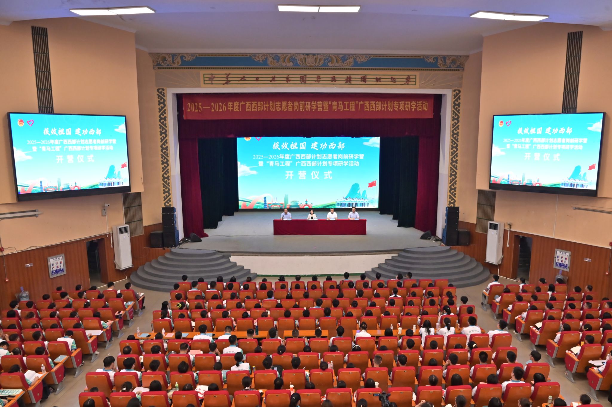 【大学生通讯社报道】7月28日,2025—2026年度广西西部计划志愿者岗前培训营暨“青马工程”广西西部计划专项研学活动开营仪式在澳门网投官方网站举行。校党委副书记陈铭彬,共青团广西区委副书记左向蕾出席开营仪式并讲话。