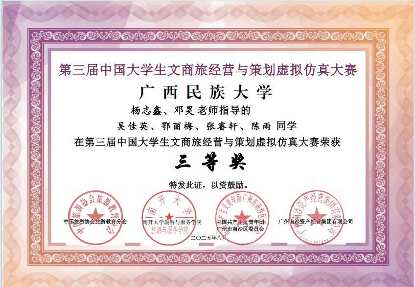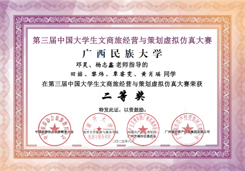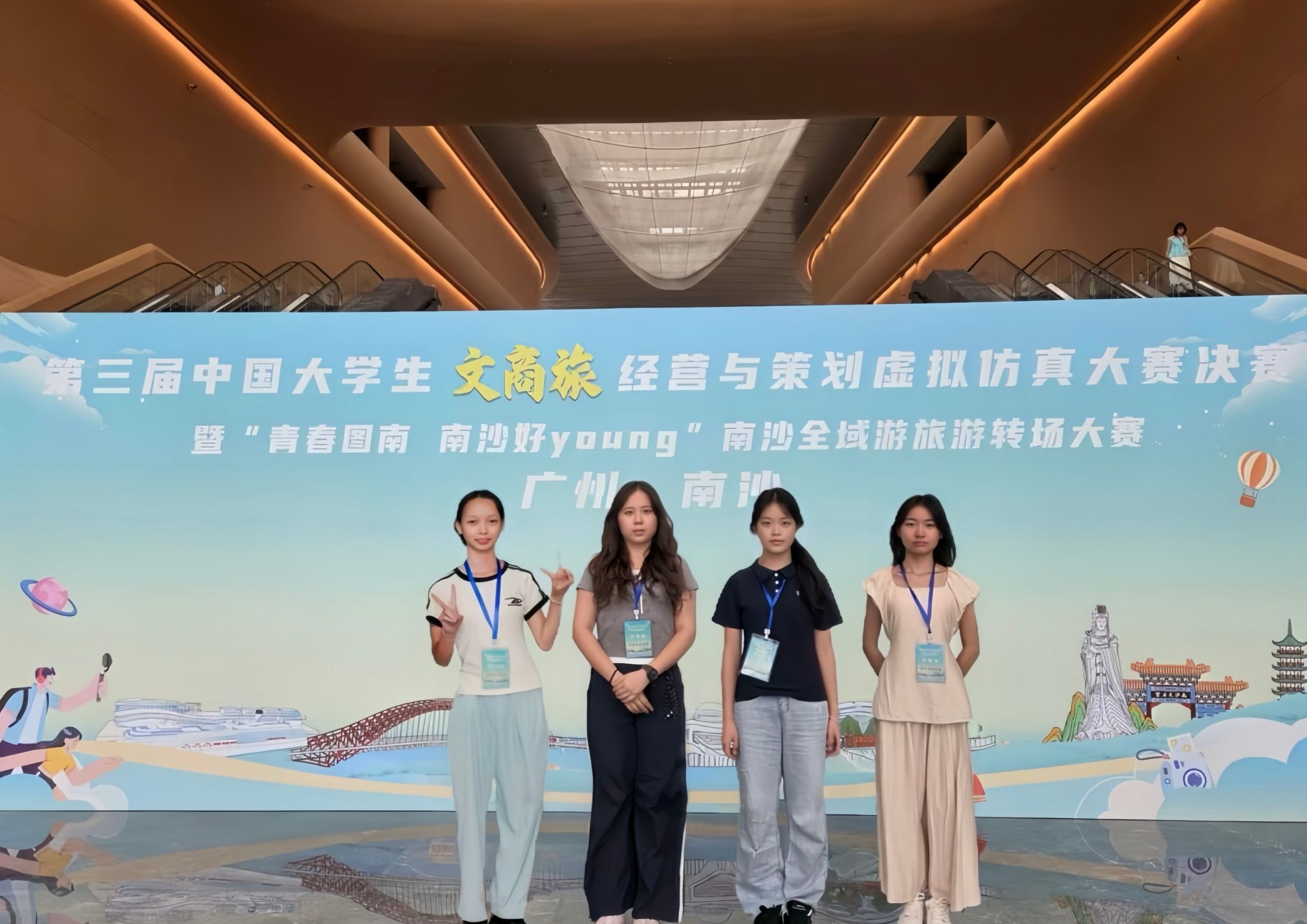 近日,第三届中国大学生文商旅经营与策划虚拟仿真大赛全国总决赛在广州南沙举行。澳门网投官方网站管理学院学子组成的两支队伍表现优异,斩获全国二等奖1项(排名全国第21)、三等奖1项、实践特等奖1项。在同期举办的“青春图南 南沙好young”南沙全域游旅游转场大赛中,两支队伍再获2项优胜奖,邓昊和杨志鑫两位教师获评“优秀指导教师”。