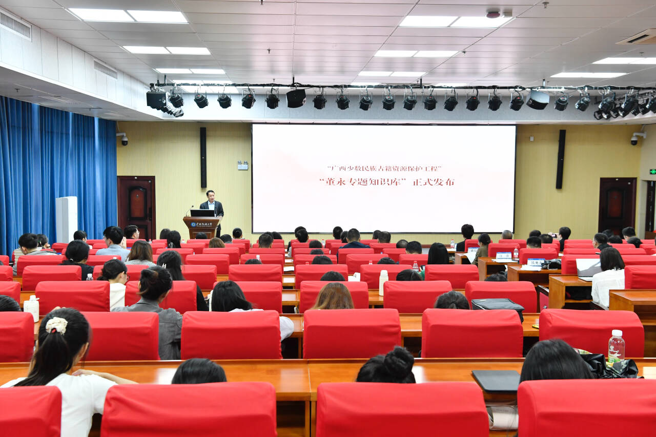朱小梅和黎洪波共同为新书揭幕,孙瑞阳代表国家民委全国少数民族古籍整理研究室向“典映中华”展阅品牌建设试点工作建设单位赠送新书。广西教育出版社同时发布两项古籍数字化新成果:“中华古壮字信息化工程”的1000个古壮字私用区编码,以及“广西少数民族古籍资源保护工程”的“董永专题知识库”,为广西少数民族古籍工作“十四五”收官又添新亮点。