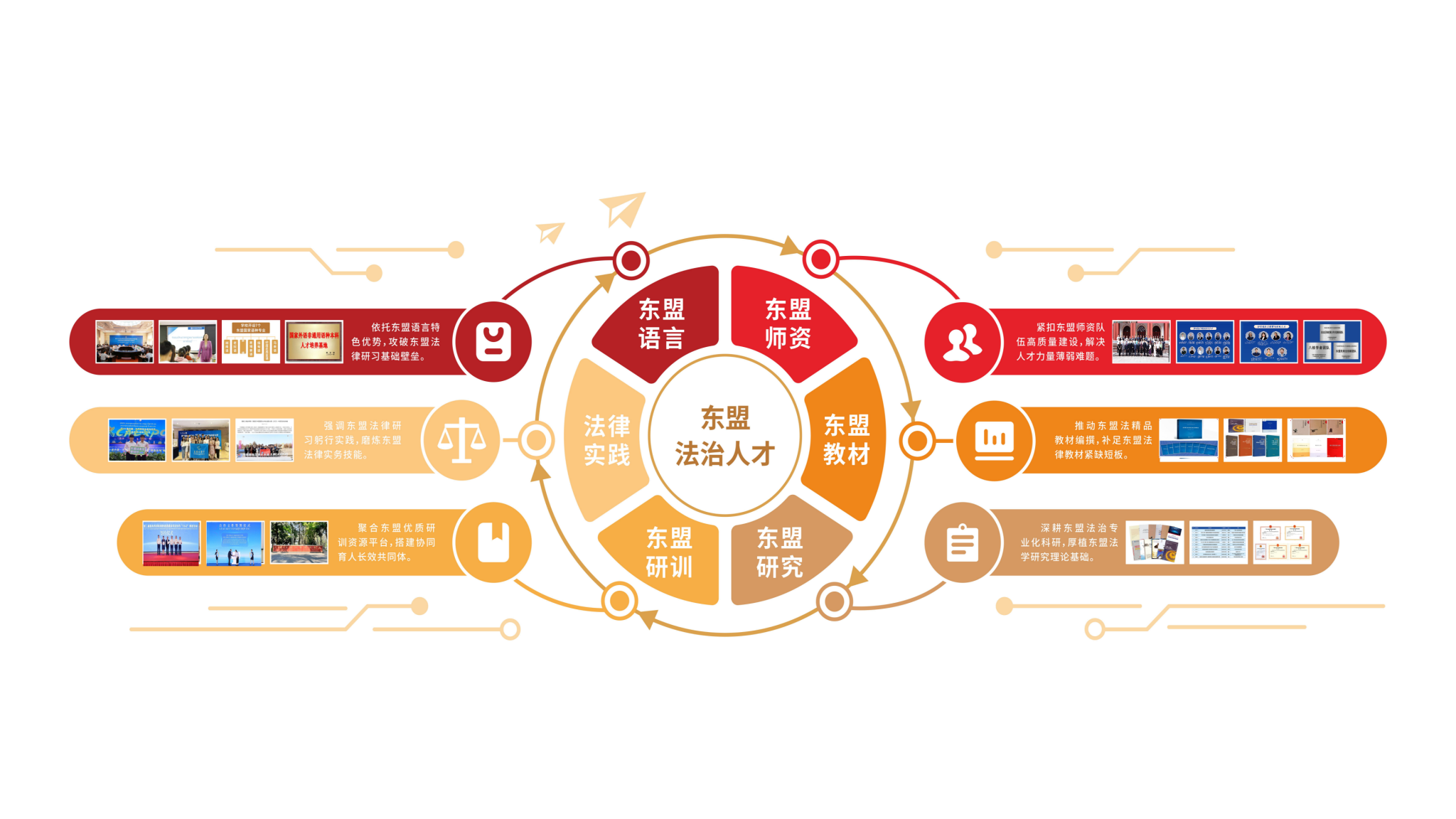 学校创新打造“六位一体”涉东盟法治人才培养模式,以东盟语言、东盟师资、东盟教材、东盟研究、东盟研训、东盟法律实践为核心支撑,构建起全方位、立体化的涉东盟法治人才培养体系,精准契合“一带一路”倡议下中国-东盟跨境法律服务的现实需求。