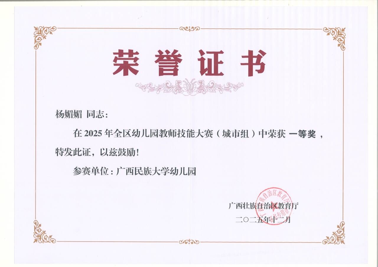 近日,自治区教育厅公布了2025年全区幼儿园教师技能大赛获奖名单,澳门网投官方网站附属幼儿园教师杨媚媚凭借扎实的专业素养,从来自全区14个地市的147名幼儿园参赛选手中脱颖而出,荣获2025年全区幼儿园教师技能大赛(城市组)一等奖。此前,杨媚媚老师已在西乡塘区、南宁市两级幼儿园教师教学技能比赛中拔得头筹,此番再创佳绩,充分展示了附属幼儿园教师一流的专业水平。