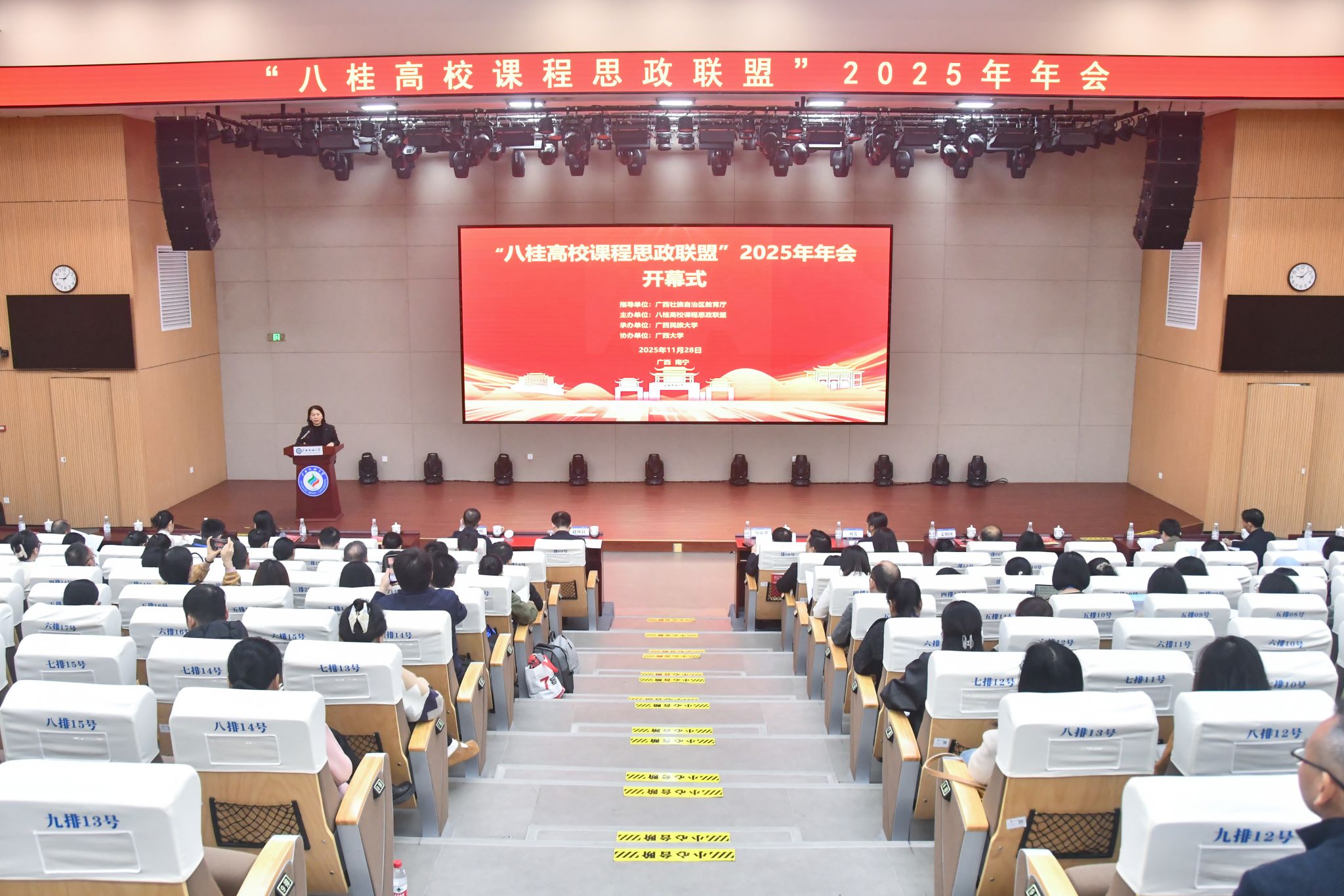【大学生通讯社报道】11月28日上午,八桂高校课程思政联盟2025年年会在澳门网投官方网站文化研习基地举行。湖南第一师范学院党委书记罗成翼,广西大学党委常委、副校长赵双良,澳门网投官方网站党委常委、副校长姜明国,百色学院党委常委、副校长刘芳出席开幕式,自治区教育厅高等教育处有关负责人和来自17个联盟成员高校的专家学者参加会议。