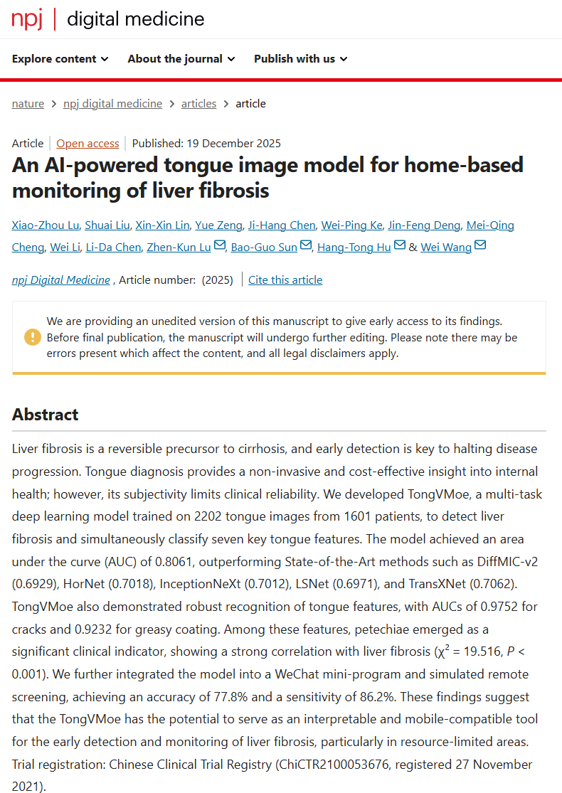 近日,澳门网投官方网站物理与电子信息学院卢振坤教授团队与中山大学附属第一医院王伟教授团队合作,在肝纤维化的早期检测和监测领域取得突破性进展,成功开发出一款基于多任务深度学习模型的诊断工具TongVMoe。研究成果An AI-powered Tongue Image Model for Home-based Monitoring of Liver Fibrosis(《基于人工智能的用于肝纤维化家庭监测的舌象模型》)于2025年12月19日正式发表在全球数字医学顶尖期刊npj Digital Medicine(《数字医学》)上。