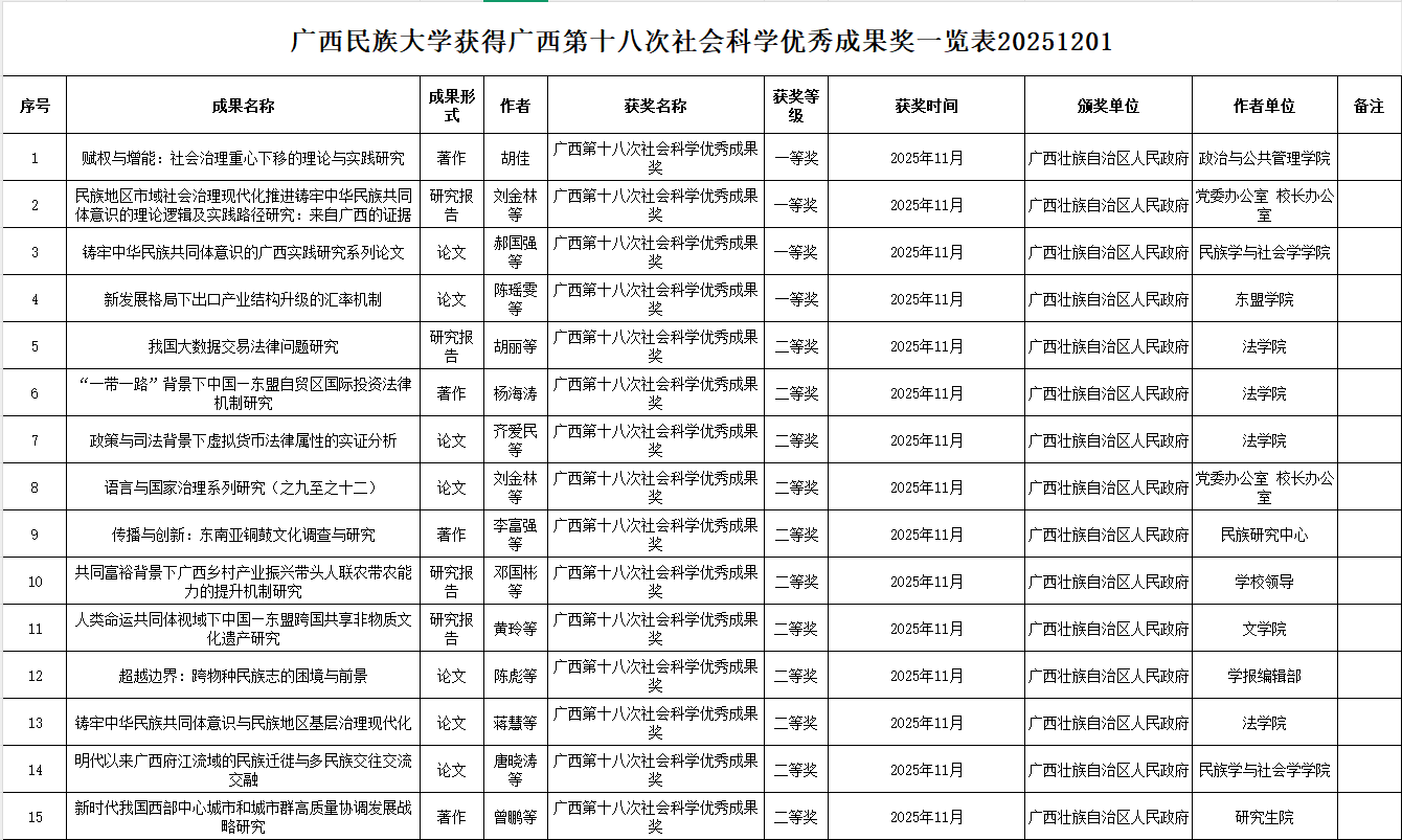广西社会科学优秀成果奖是广西社科领域的最高荣誉,代表广西哲学社会科学研究的最高水平。学校将进一步巩固优势学科、培育特色方向、激发科研潜能,持续提升科研创新能力与成果转化质效,推动学校哲学社会科学研究迈向新高度、实现新跨越,为奋力谱写中国式现代化广西篇章贡献更多优质学术成果与智力支持。(初审:滕兰花 编辑:韦丽娜 复审:韦利坤 终审:孙寿媚)
